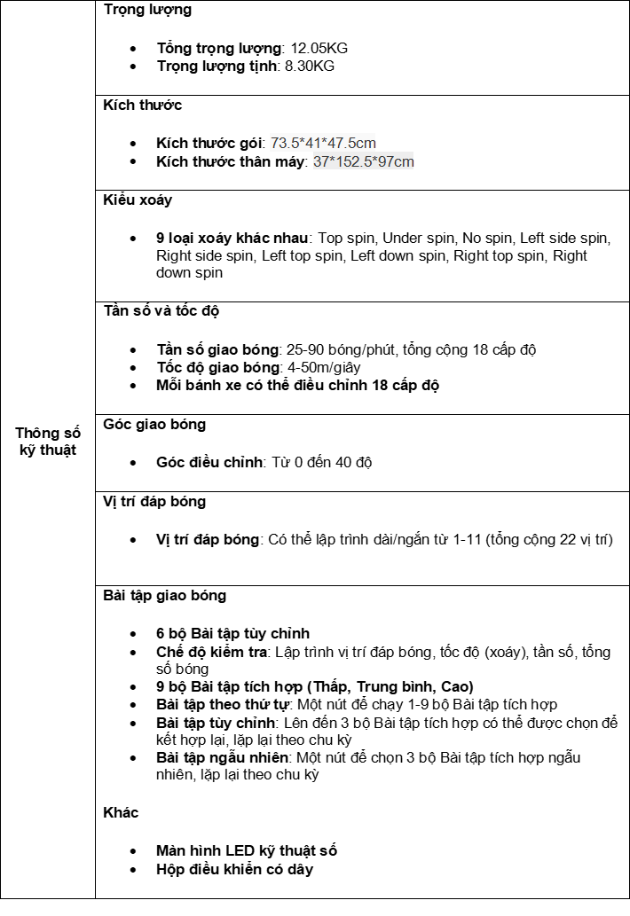 – Tính năng đa dạng, phù hợp với nhiều cấp độ người chơi khác nhau, từ người mới bắt đầu cho đến chuyên gia bóng bàn. – Độ chính xác cao trong việc bắn bóng, giúp bạn nâng cao kỹ năng nhanh chóng. – Thiết kế chắc chắn, bền bỉ, tăng độ an toàn khi sử dụng.