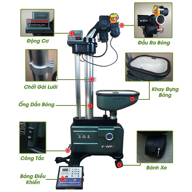 - Đi kèm theo máy: 1 Màn hình LED kĩ thuậy số, 1 Bộ nguồn, 1 Bộ khung lưới thu bóng tự động
