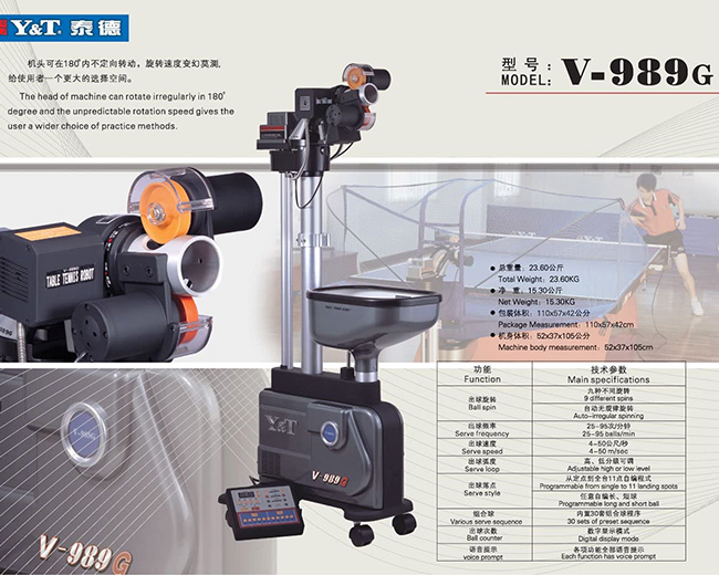 Máy bắn bóng bàn Y&T V989 G được thiết kế thông minh, trang bị nhiều chế độ bắn bóng cho người tập và có khả năng điều chỉnh tốc độ, độ xoáy dễ dàng. Mẫu máy bắn này hiện đang được sử dụng rất nhiều cho người chơi bóng bàn tại nhà lẫn trung tâm đào tạo bóng bàn chuyên nghiệp. – 9 loại xoáy bóng: Máy bắn bóng bàn Y&T V989 G có thể tạo ra 9 loại xoáy bóng khác nhau, bao gồm: xoáy trên, xoáy dưới, xoáy trái, xoáy phải, xoáy trái trên, xoáy trái dưới, xoáy phải trên, xoáy phải dưới. Điều này giúp người chơi luyện tập các kỹ năng đánh bóng với xoáy khác nhau. – Điều chỉnh tốc độ bóng và tần suất đánh: Với Y&T V989 G, bạn có thể điều chỉnh tốc độ bóng từ 4-50 mét/giây và tần suất đánh từ 25-95 bóng/phút. Bạn có thể luyện tập với nhiều mức độ khác nhau. – Góc bắn bóng linh hoạt: Máy có thể điều chỉnh góc bắn bóng từ 0-40 độ. Điều này giúp người chơi luyện tập các kỹ năng đánh bóng ở nhiều vị trí khác nhau. – Điểm rơi bóng linh hoạt: Máy có 22 điểm rơi bóng khác nhau, bao gồm 11 điểm rơi dài và 11 điểm rơi ngắn. – Màn hình LED hiển thị thông số: Màn hình LED hiển thị các thông số như tần số, tốc độ, góc và điểm rơi bóng. Người chơi dễ dàng theo dõi và điều chỉnh các thông số trong quá trình tập luyện. – Có tích hợp giọng nói hỗ trợ người chơi tập phán đoán hướng bóng.Thông số kỹ thuật: