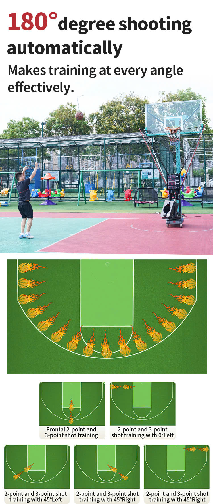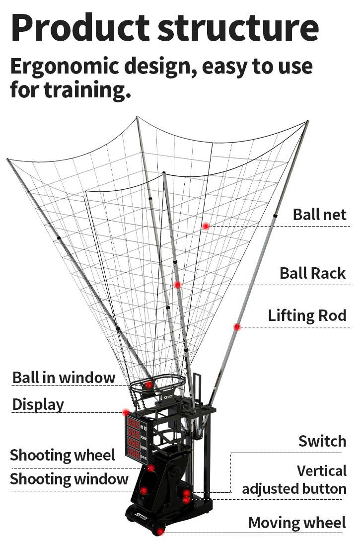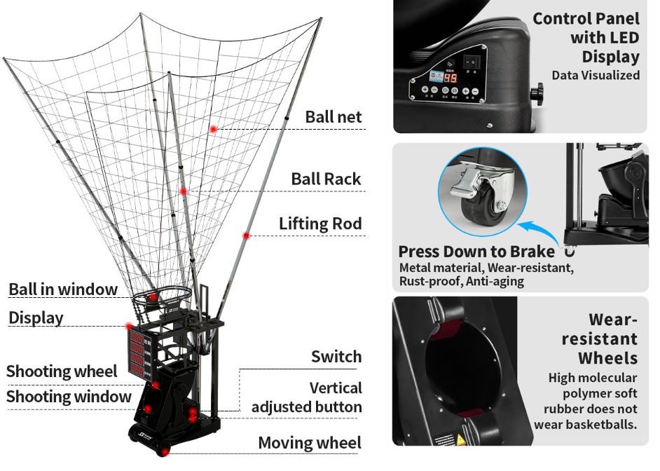 - Đa dạng chế độ tập luyện: Từ bài tập cố định, bài tập xoáy, đến bài tập ngẫu nhiên, máy hỗ trợ nhiều chế độ bắn bóng, giúp bạn luyện tập các kỹ năng ném rổ từ mọi vị trí trên sân, từ ném gần rổ đến ném 3 điểm.