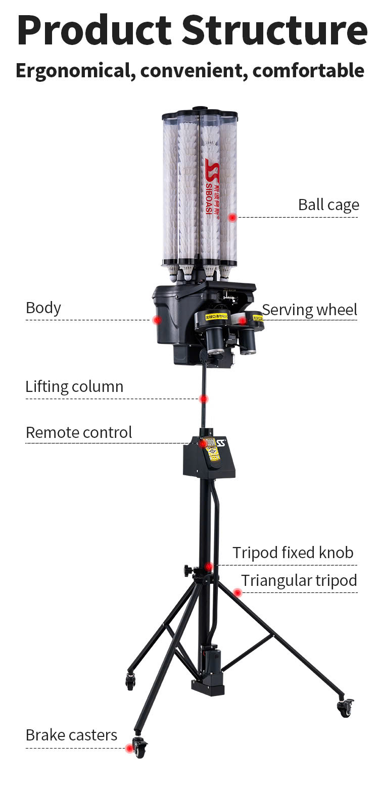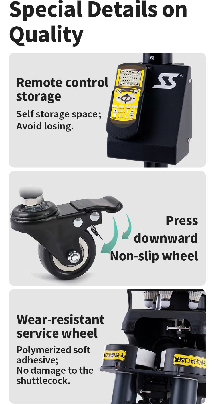 - Thiết kế bền bỉ, dễ sử dụng: Máy được làm từ vật liệu cao cấp, kết hợp bánh xe di chuyển tiện lợi, phù hợp cho cả sân tập trong nhà và ngoài trời.