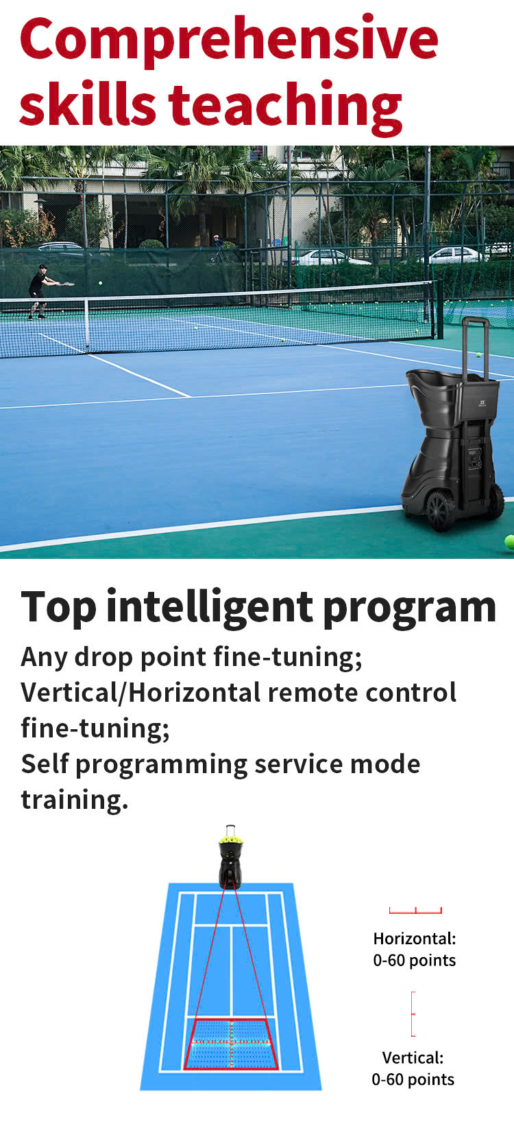 - Bài tập thông minh: Tùy chỉnh tốc độ giao bóng, góc, tần suất, và độ xoáy để phù hợp với nhu cầu luyện tập cá nhân.