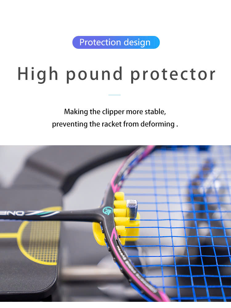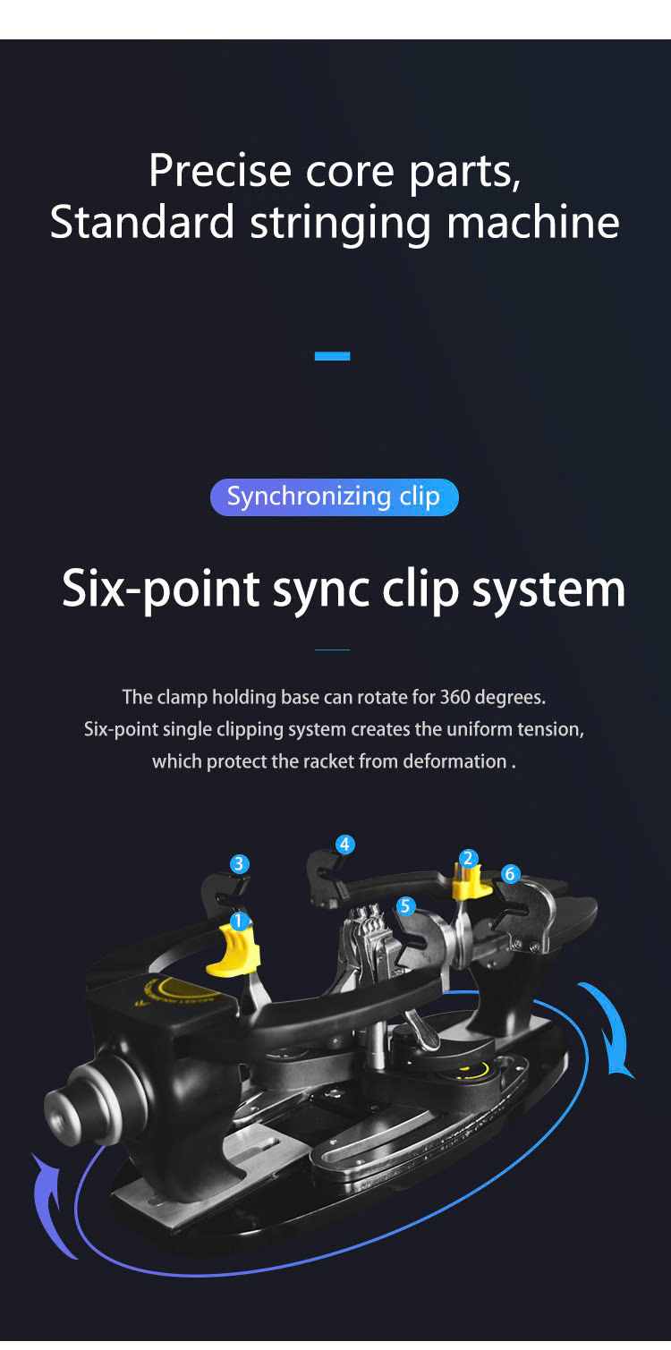 - Hệ thống kẹp vợt đồng bộ, định vị sáu điểm, lực tác động lên vợt đồng đều hơn.