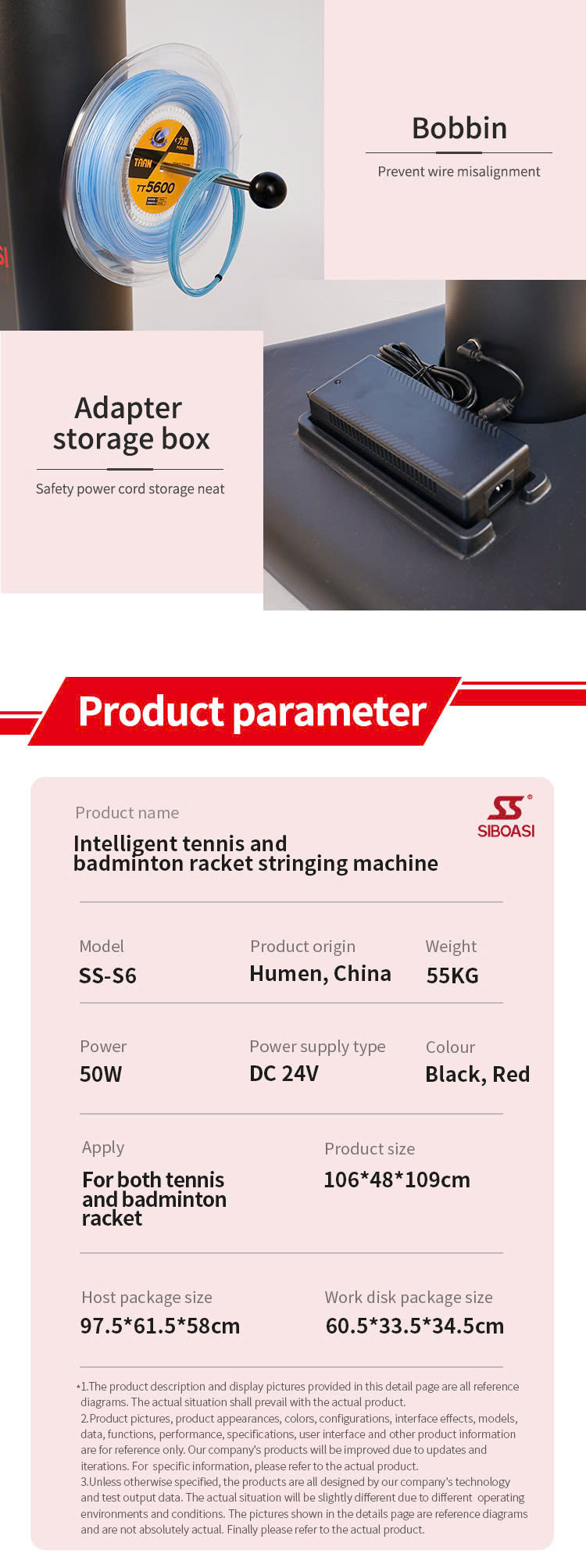 Máy căng vợt SIBOASI S6 là thiết bị cải tiến và tiên tiến về mặt công nghệ được thiết kế dành cho người chơi tennis và cầu lông. ✔ Dành cho vợt cầu lông và vợt tennis ✔ Hệ thống khóa bàn làm việc tự động ✔ Tốc độ, âm thanh, kg/lbs có thể điều chỉnh ✔ Tự kiểm tra, thắt nút, lưu trữ, kéo căng trước, chức năng kéo liên tục ✔ Hệ thống giữ vợt đồng bộ và hệ thống giữ kẹp tự động ✔ Chiều cao có thể điều chỉnh cho những người có chiều cao khác nhau